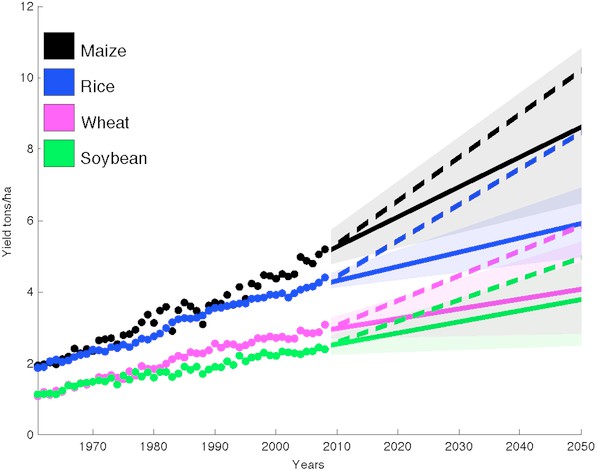 This chart shows yields per acre for the important foundational crops corn, rice, wheat and soybeans. The solid lines show what would happen if this growth continued. The dashed lines, however, show what is really needed to satisfy expected demand by 2050.825