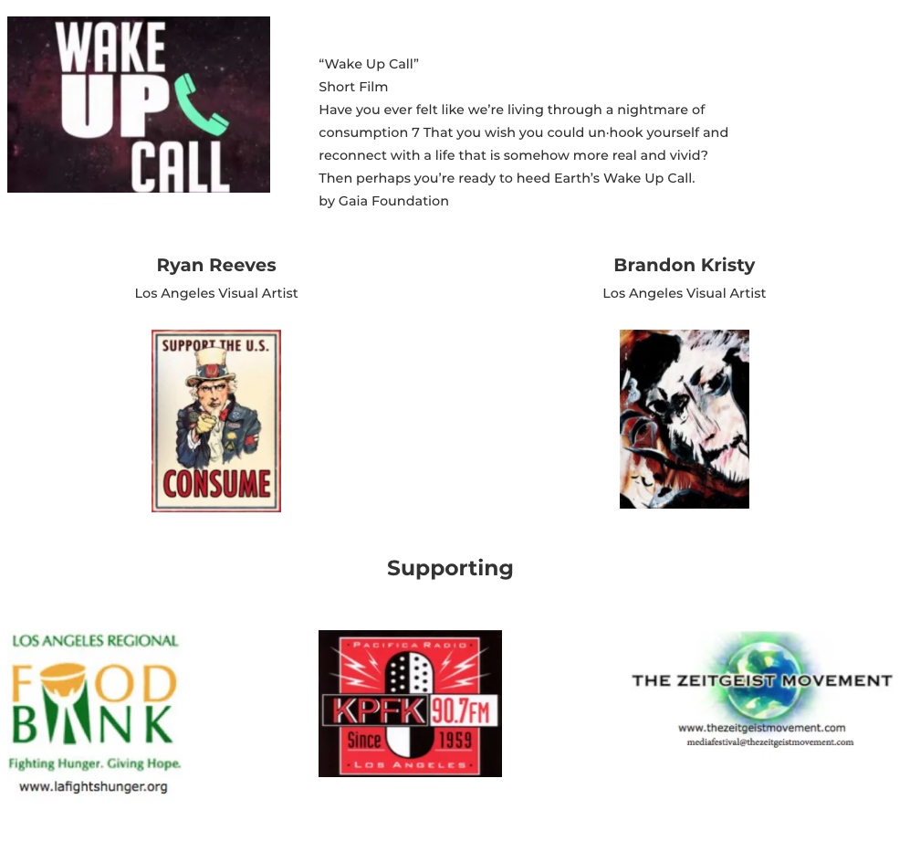 Partners for previous years’ festivals include: Artivist Film Festival, KPFK Radio, Avalon Hollywood, Project Peace On Earth,Stickam.com, Cell-nique, LA Food Bank, Creative Wsions, Good Planet Media, Leaders Causing Leaders