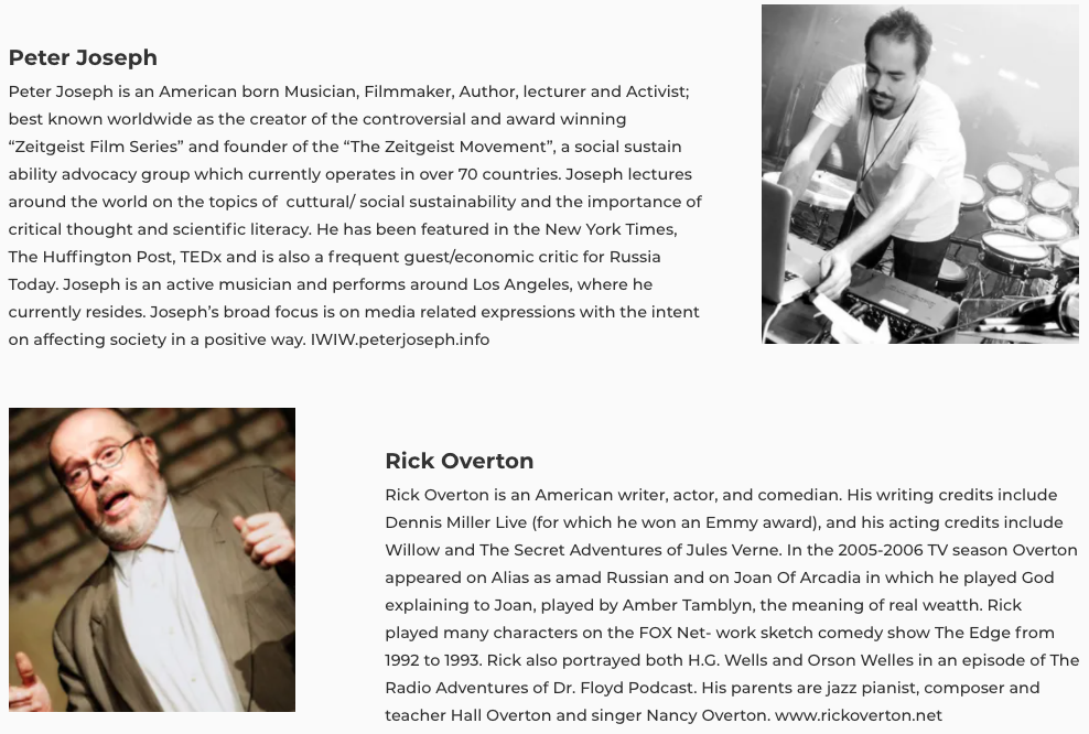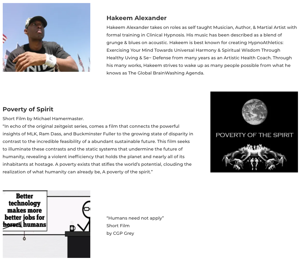 Recognizing the power of art and media to help shift consciousness, the annual “Zeitgeist Media Festival bridges the artistic & activist communities in the hope to inspire change. It recognizes that deeply needed, radical changes in the structural/economic workings of society can only manifest in tandem with a personal/social transformation of values in each of us.