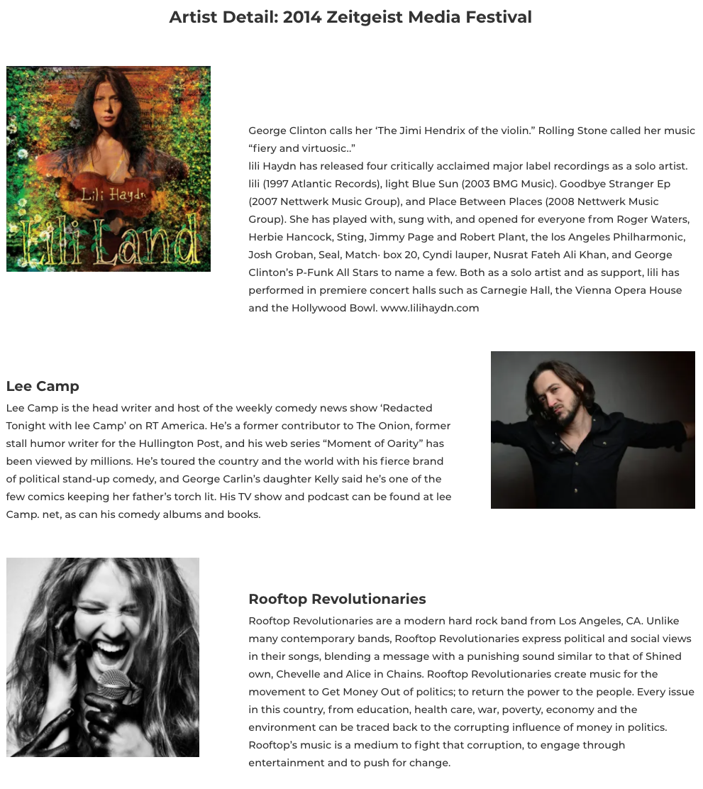 This year’s socially-minded artists will include the event’s headliner, the legendary Lili Haydn, award winning comedians Rick Overton and Lee Camp; ‘Zeitgeist’ filmmaker & founder Peter Joseph and the sensational live music of Rooftop Revolutionaries, The Siren, Nomi Abadi, Heather Donovan, Ben Stewart, Captain Danger, the art of Near One and many more performers, installations and short films.