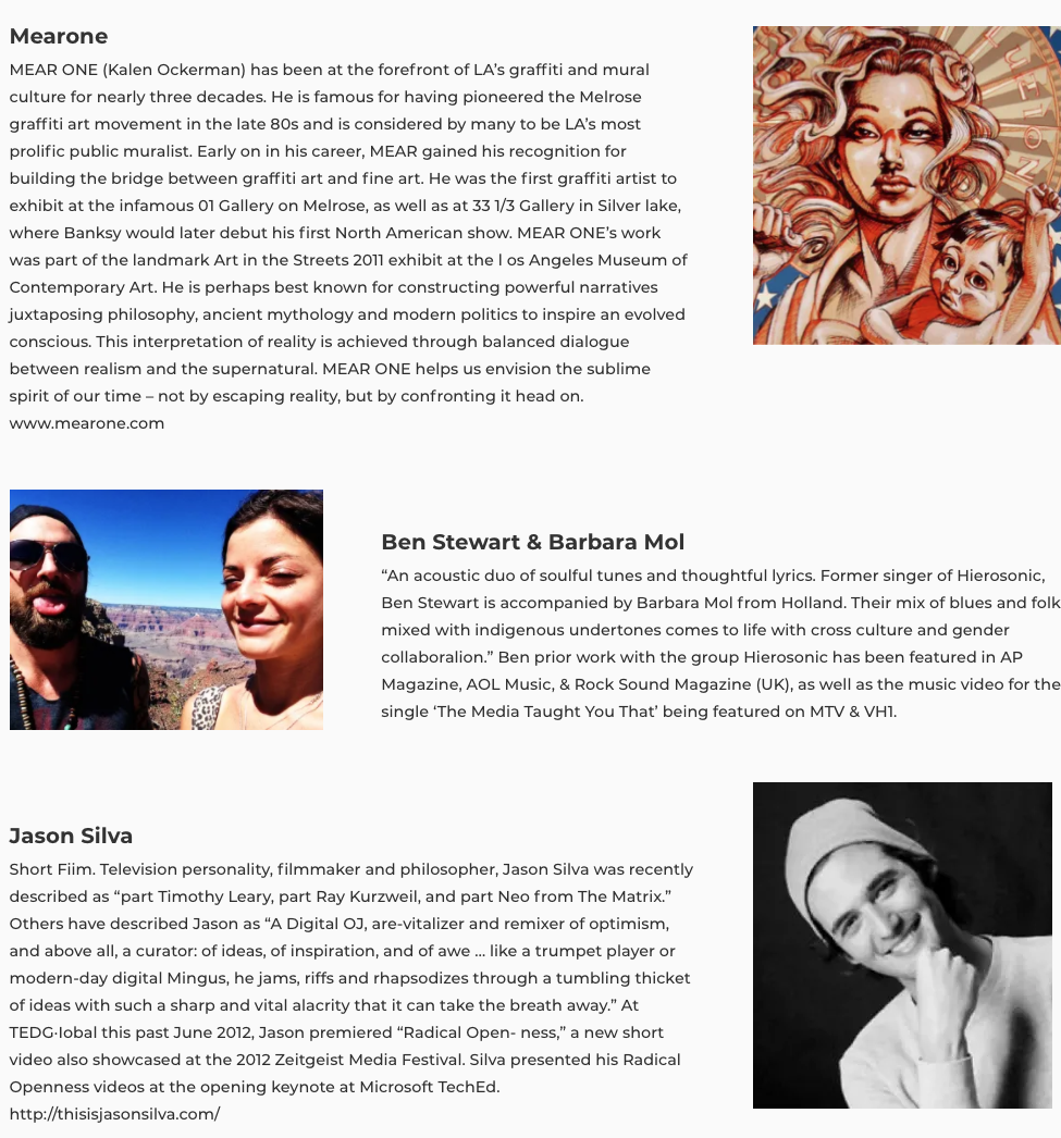 Sufi singer & composer Sussan Deyhim, Emmy-nominated TV writer (“Heroes”, “Touch”) Tim Kring,international best-selling author Marianne Williamson, Emmy-winning comedian Rick Overton, violin virtuoso and activist Lili Haydn, acting Icons Rutger Hauer & Charles Fleischer, Grammy-winning singer/songwriter Gary Nicholson and many more. Film short screenings,which are a large part of each festival, have featured James Cromwell, Jason Taylor, Mark Magidson, Jason Silva, George Langworthy and more.